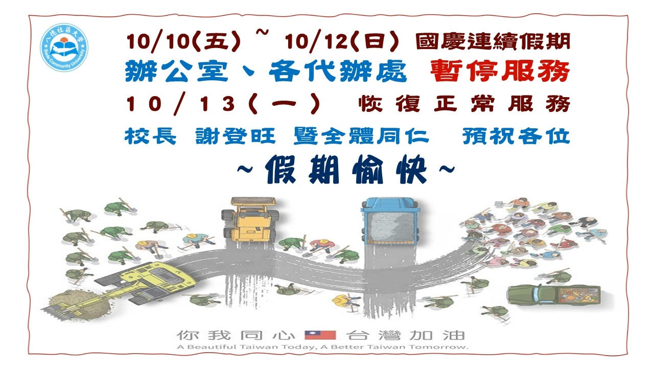 10/10(五) ~ 10/12(日) 國慶連續假期