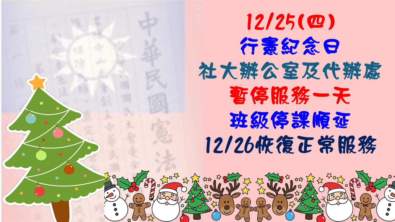 12/25(四)行憲紀念日社大暫停服務一天