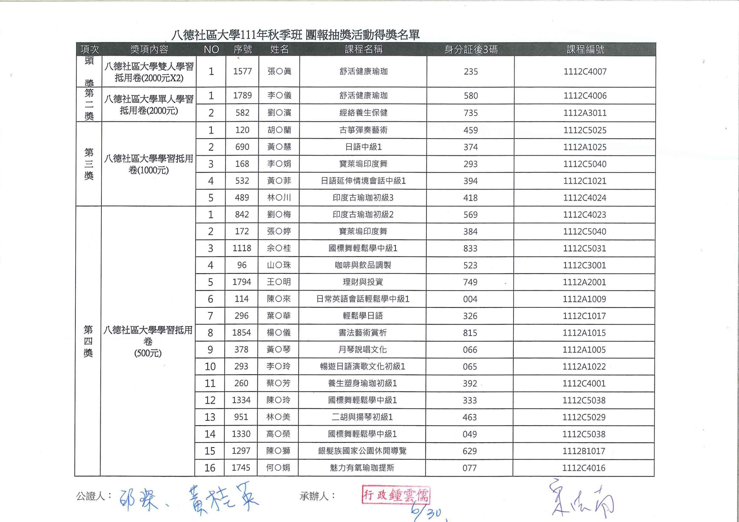【八德社區大學1112期團報抽獎活動中獎人名單及領獎通知】