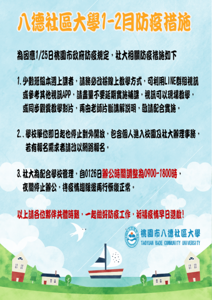為因應今早桃園市政府防疫規定,即日起停止各學校及場館之各種學習及活動,改採線上教學方式,學校單位自即日起亦不對外開放,社大因應措施如下: