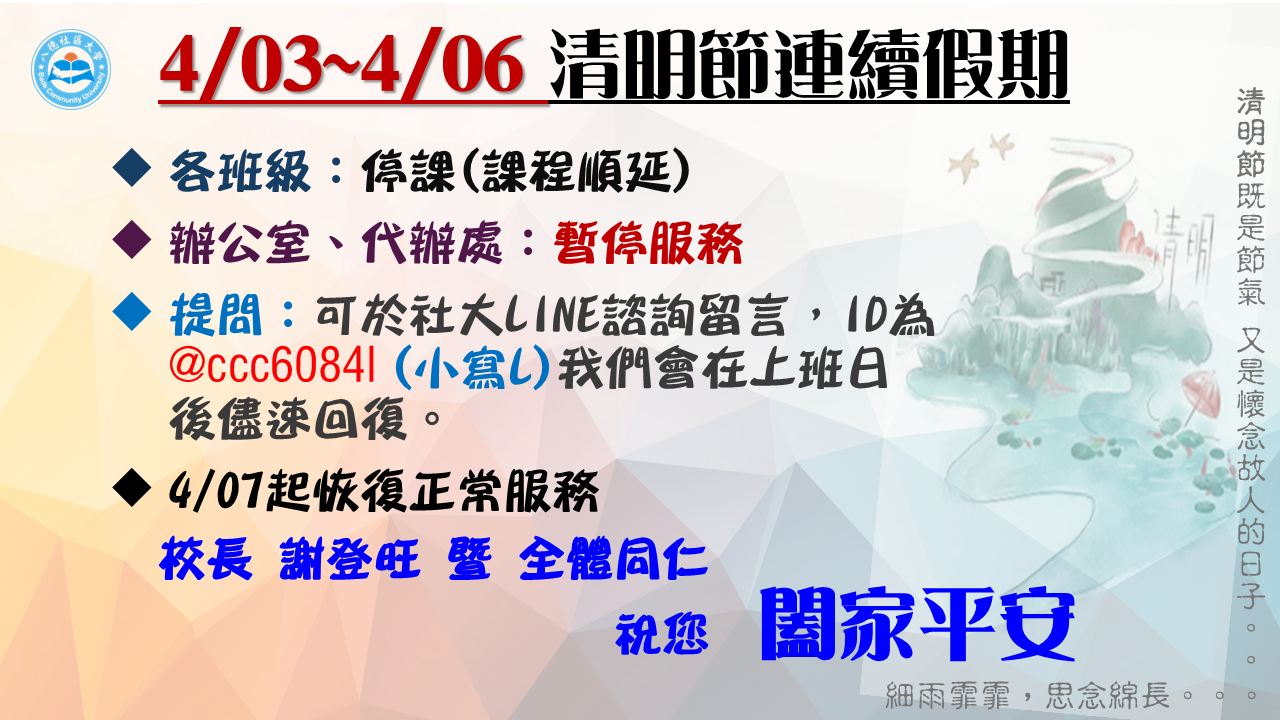 2025/4/14/03~4/06 清明節連續假期公告