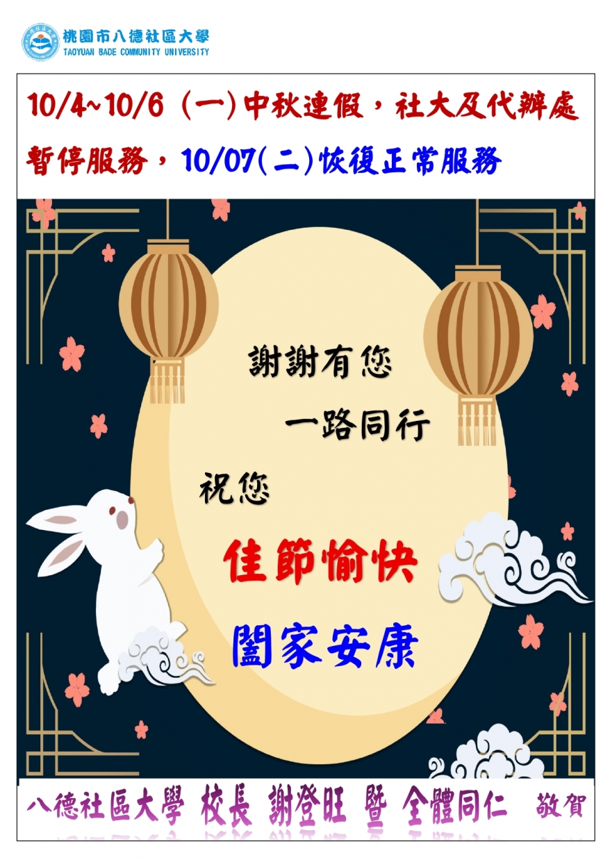 10/4~10/6中秋連假,社大及代辦處暫停服務,10/07(二)恢復正常服務,各班課程順延一週。