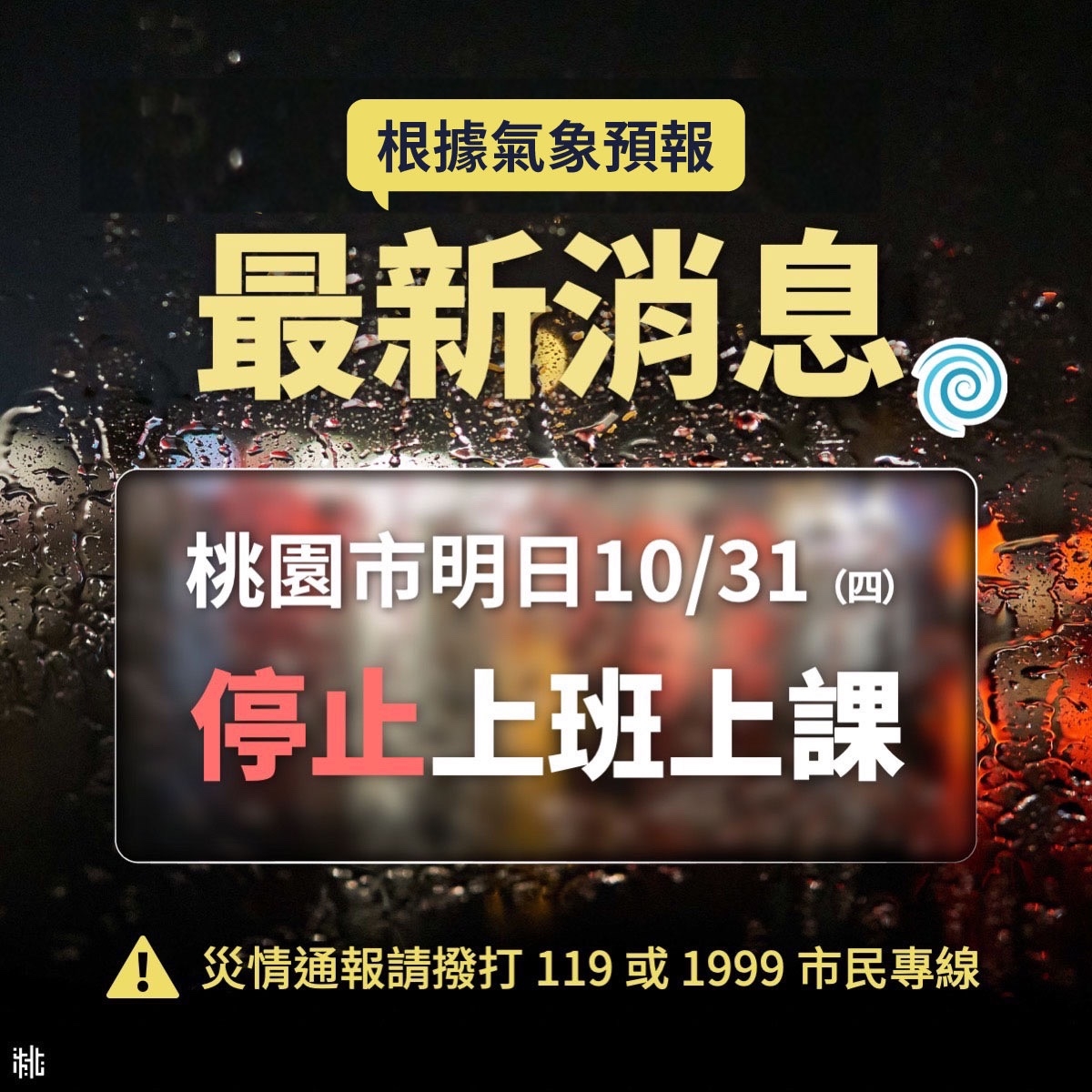 依桃園市政府公告:明日10/31停班、停課,社大10/31公論場次停止辦理,取消場次如下:
