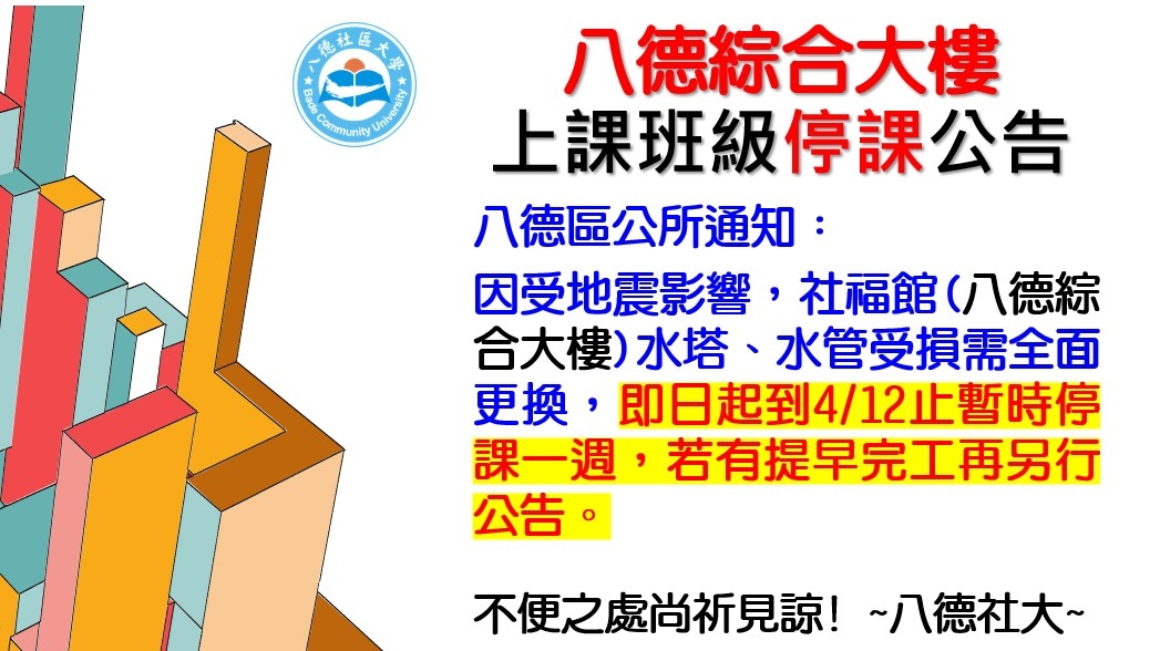 2024/4/8八德綜合大樓因受地震影響停課公告