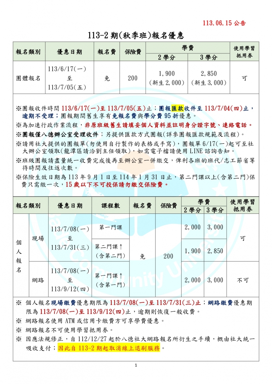 ※ 個人報名現場繳費優惠期限為113/7/08(一)至113/7/31(三)止;網路繳費優惠期限為113/7/08(一)至113/9/12(四)止,逾期則恢復一般收費。