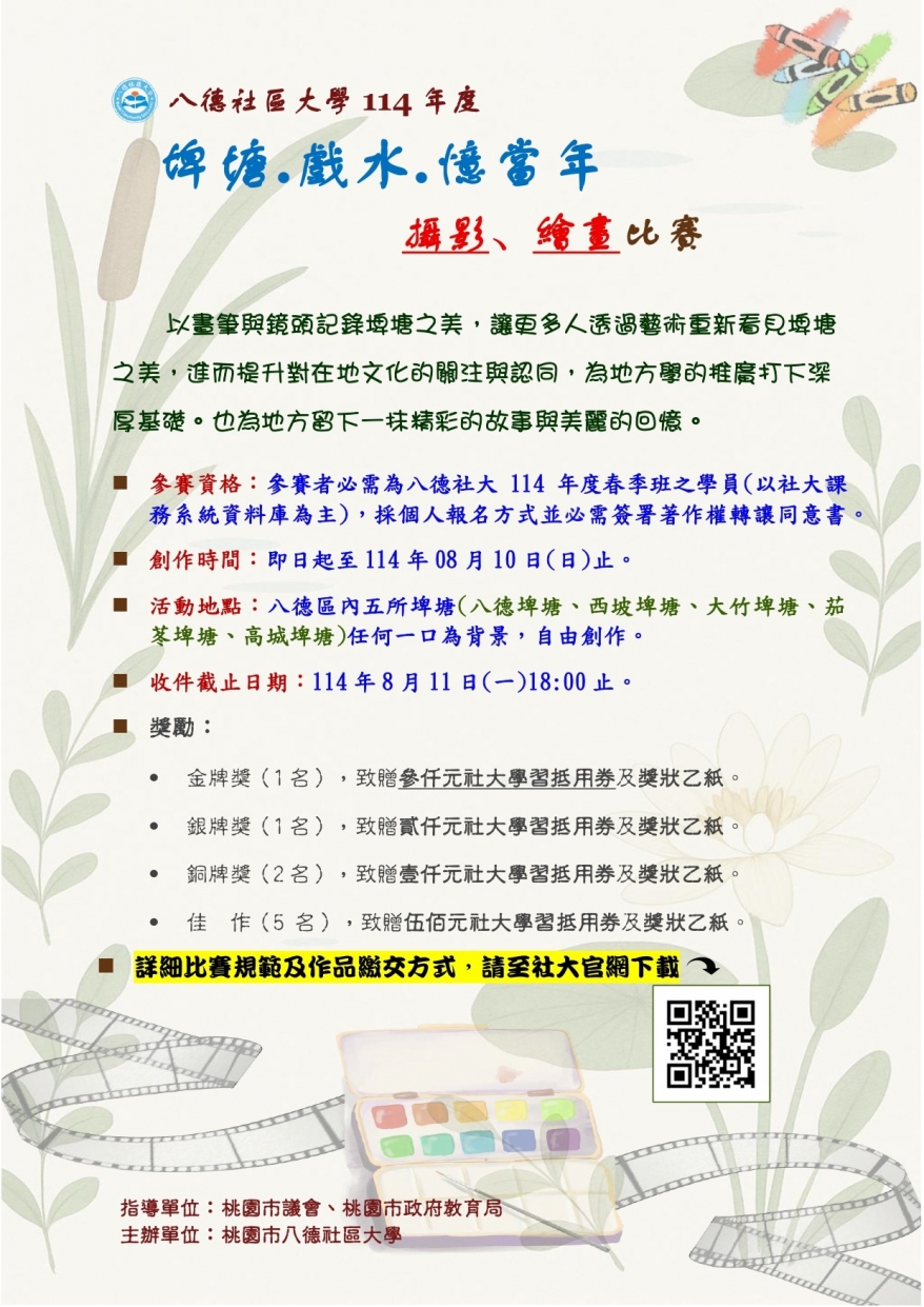 - 參賽資格:參賽者必需為八德社大114年度春季班之學員(以社大課務系統資料庫為主),採個人報名方式並必需簽署著作權轉讓同意書。
