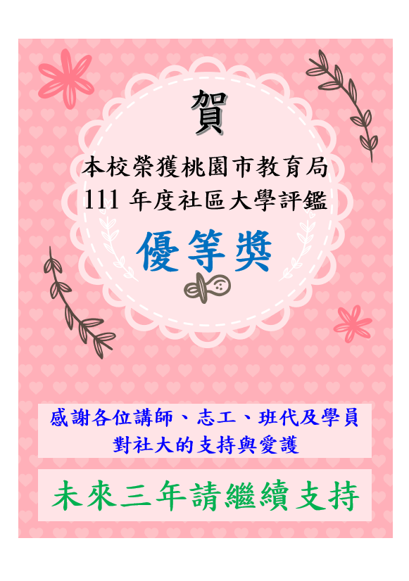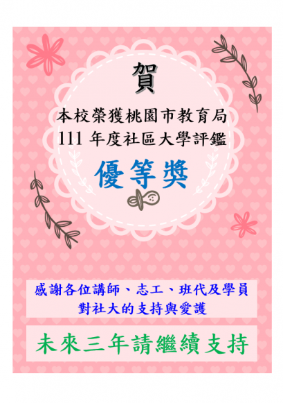 2022/12/15賀!本校榮獲桃園市教育局 111年度社區大學評鑑 優等獎