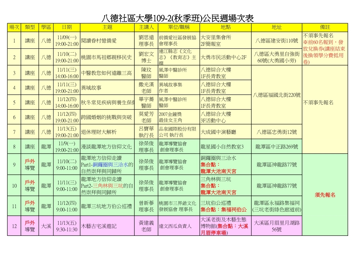 *八德社大109-2期(秋季班)公共論譠場次表*