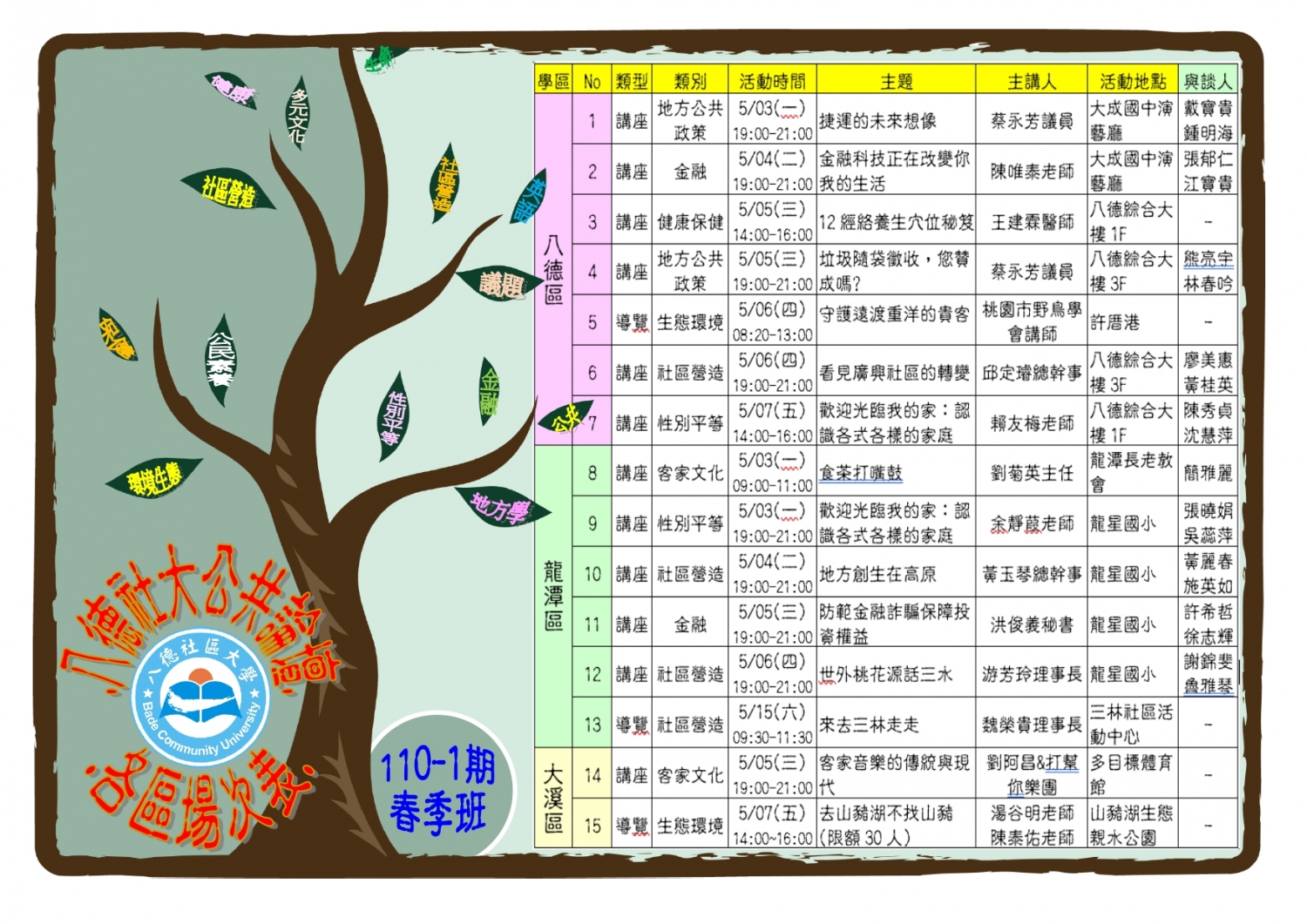- 110-1期(春季班)公共論譠場次表如附圖: