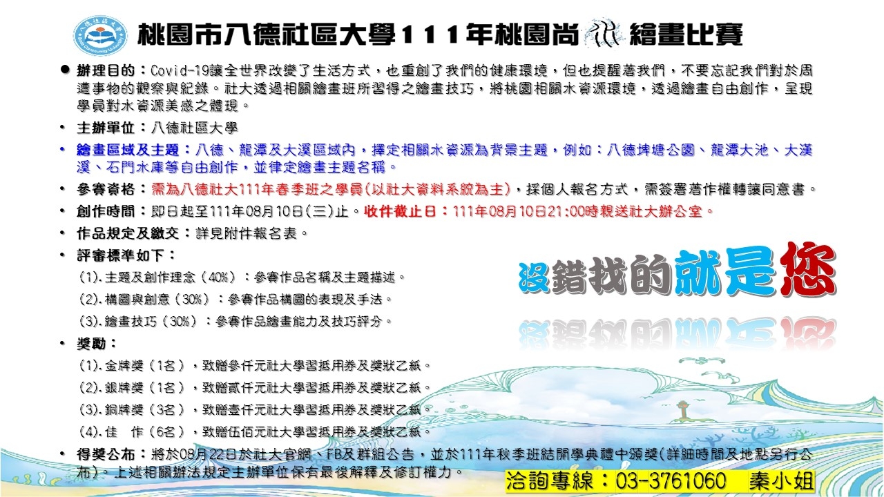 【社大公告】桃園市八德社區大學111年「桃園尚水」繪畫比賽