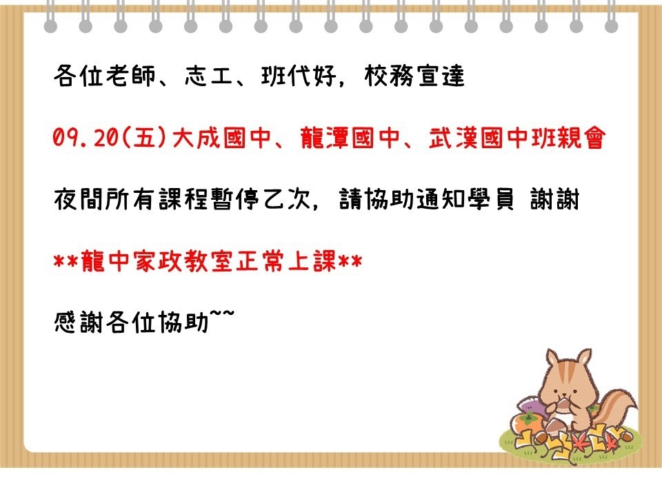 2019/9/199/20(五)部分班級停課公告